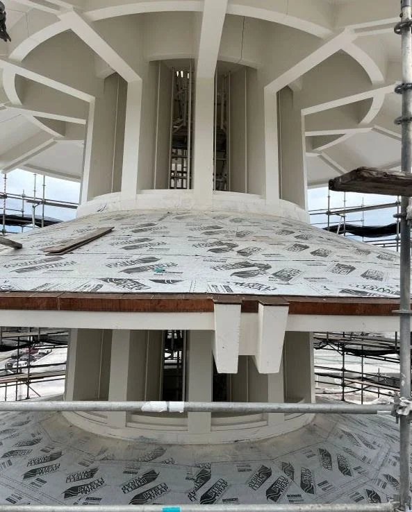 The copper roofing is being installed. The roof will be bright until it patinas to its final historic color, approximately six to eight weeks after installation.