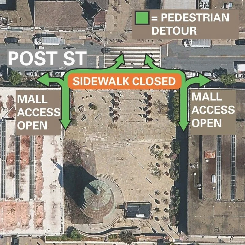 Access to the East Mall is detoured through in the center of Post St Construction barrier which will remain in place into October while the semi-permanent walkway is constructed. Once completed, contractor will create a detour to the west mall from the middle of Post Street.