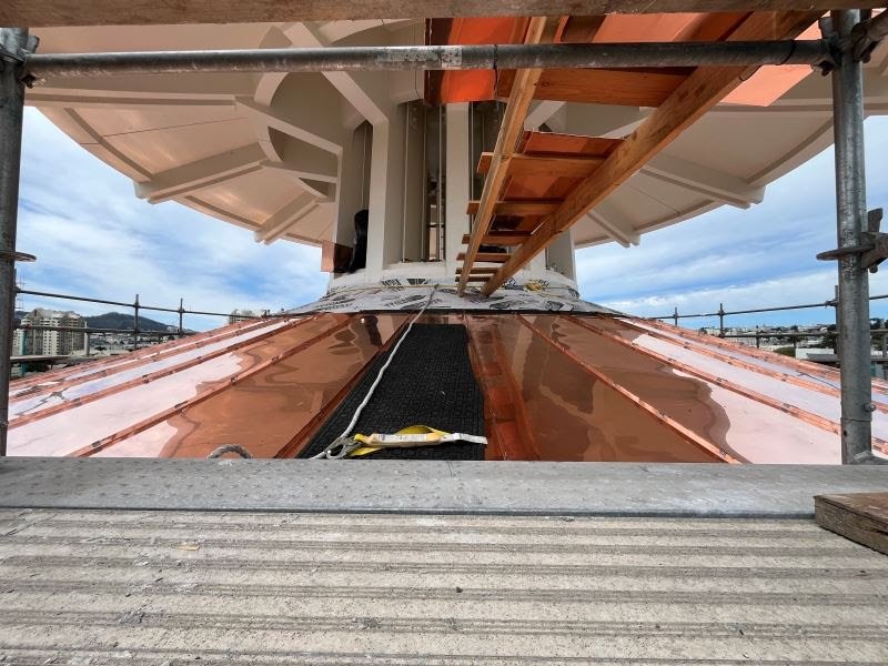 The waterproofing underlayment on the pagoda roof is now complete, and installation of the copper roof will start next month.